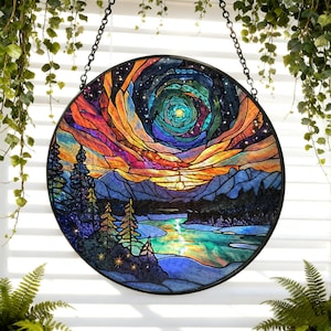 Night Sky Northern Lights Stained Glass Suncatcher Aurora Borealis Forest Northern Lights Window Hanging,Christmas Gift Nature
