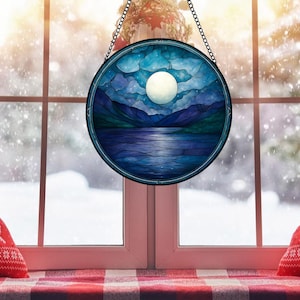 Moonlit Mountain Lake Stained Glass Suncatcher, Blue Night Sky Suncatcher Window Hanging